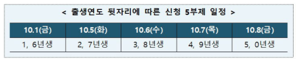 내달 1일부터 참여 신청을 접수한다. 첫 일주일간은 출생연도 뒷자리에 따라 5부제로 운영한다. 5부제가 끝나면 사업기간이 끝나는 11월 30일까지 신청 가능합니다.