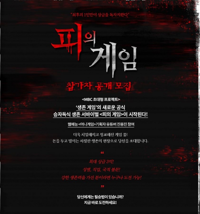 이번주 공개된 MBC 월요일 예능 프로그램 피의 게임에 대해 알아보겠습니다. 오징어게임의 예능판이라고 하는데요. 예고편을 보니 뭔가 자극적이어서 공중파에서 시청률 사냥을 위해 큰 결단을 내린 것 같네요.